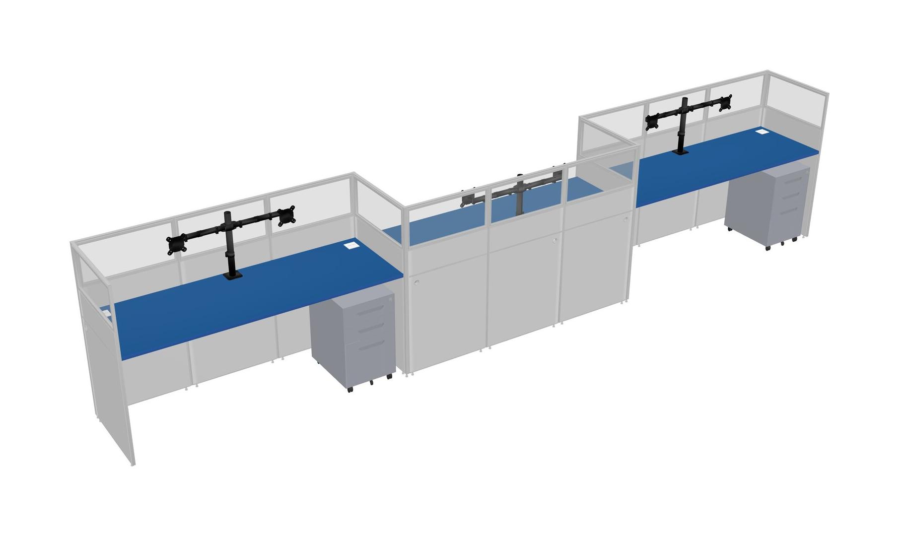 Prism Blue Rectangular Cubicle Workstations For 3 - Zigzag Formation + Grey Metal Mobile Drawers