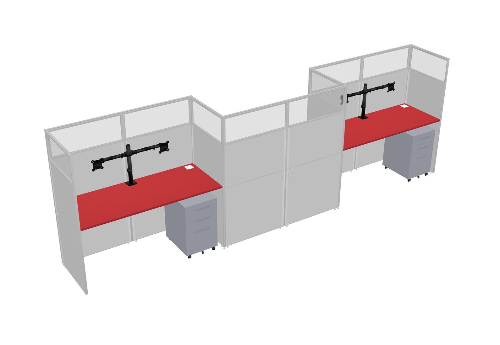 Prism Red Rectangular Cubicle Workstations For 3 - Zigzag Formation + Grey Metal Mobile Drawers