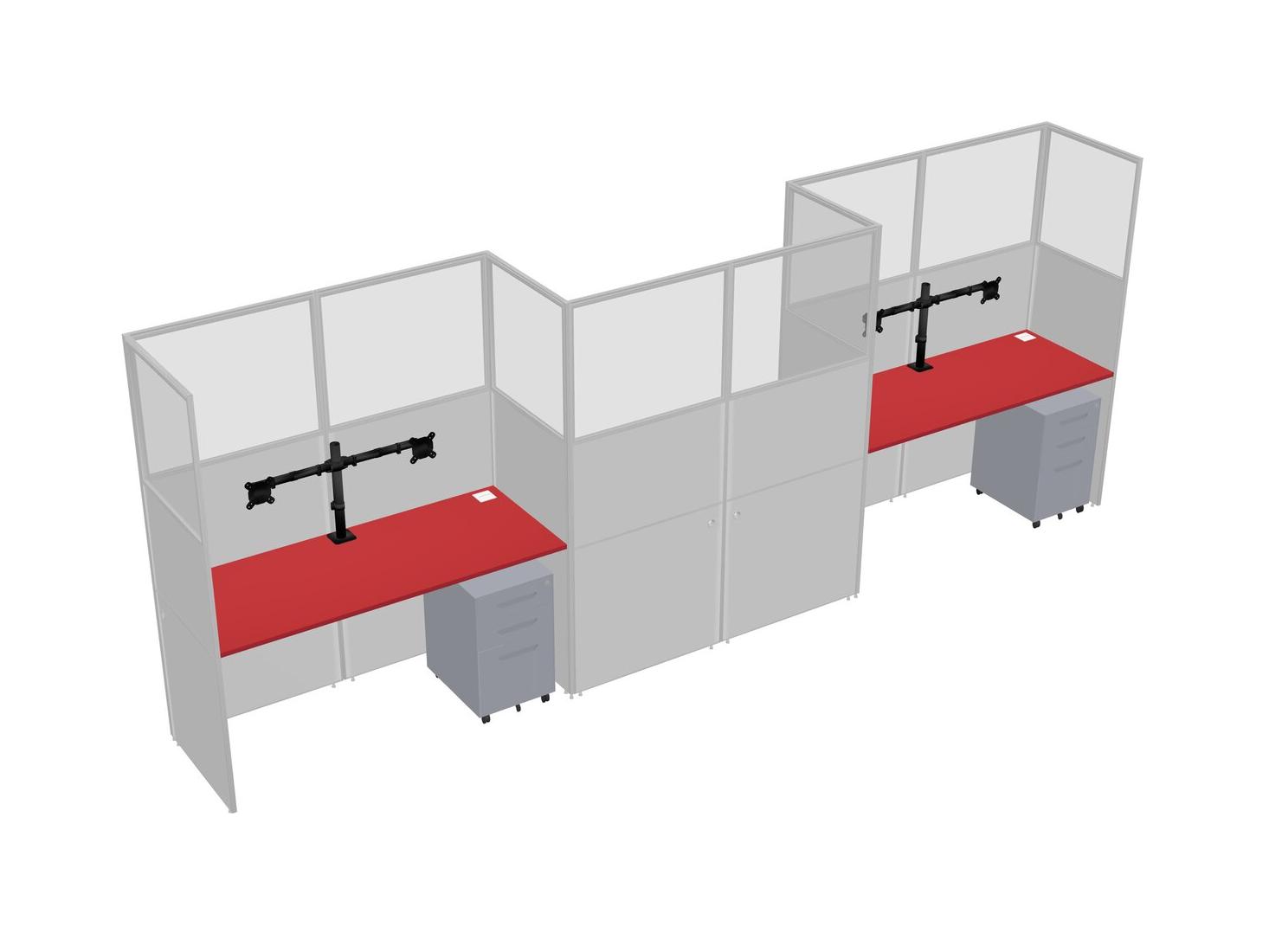 Prism Red Rectangular Cubicle Workstations For 3 - Zigzag Formation + Grey Metal Mobile Drawers