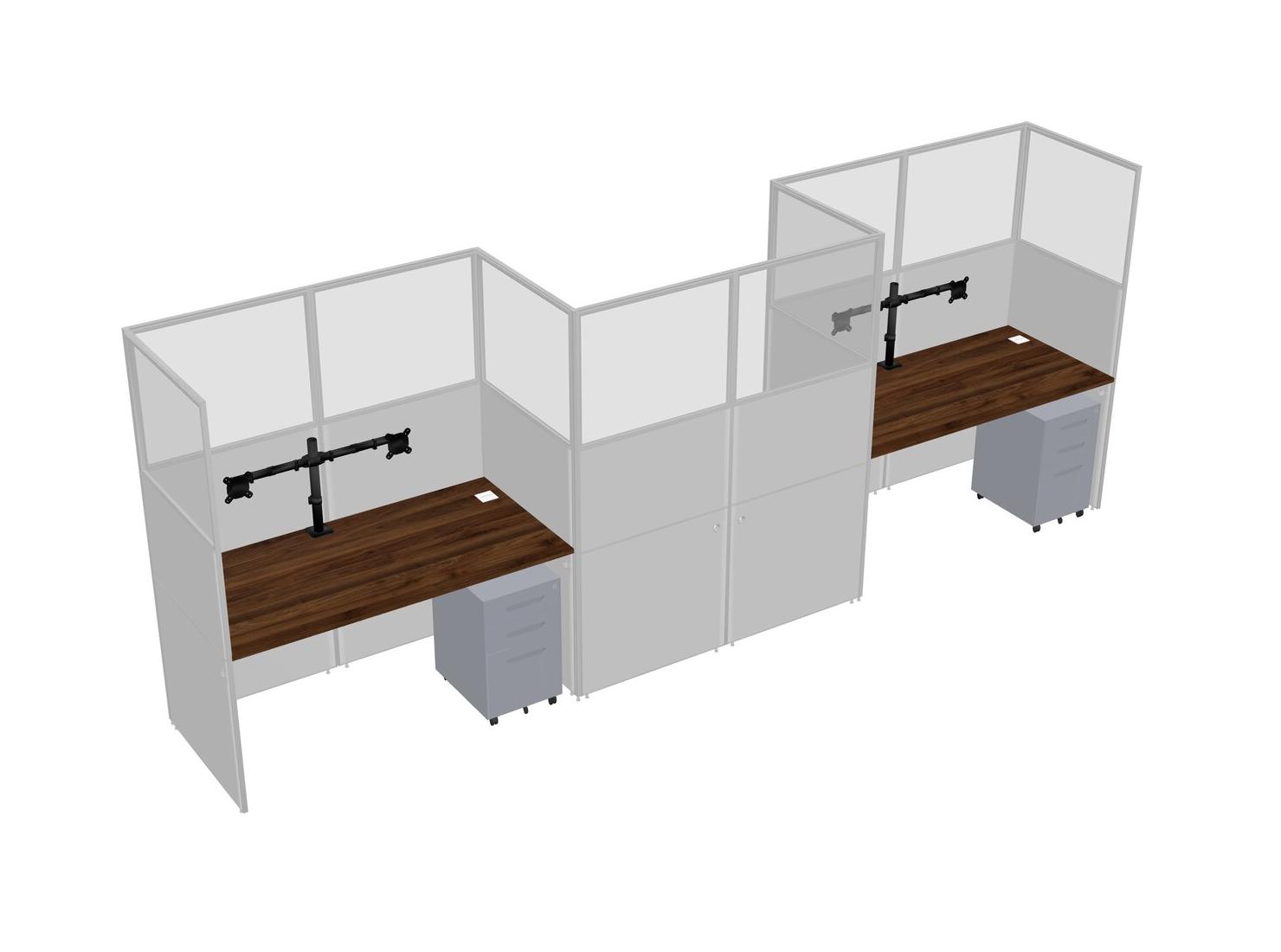 Columbia Walnut Rectangular Cubicle Workstations For 3 - Zigzag Formation + Grey Metal Mobile Drawers