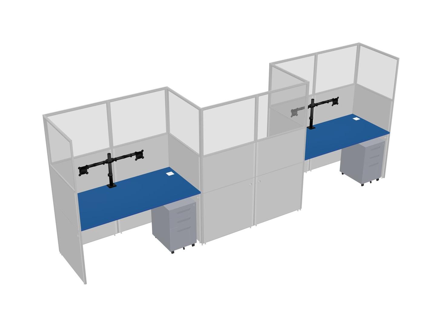 Prism Blue Rectangular Cubicle Workstations For 3 - Zigzag Formation + Grey Metal Mobile Drawers