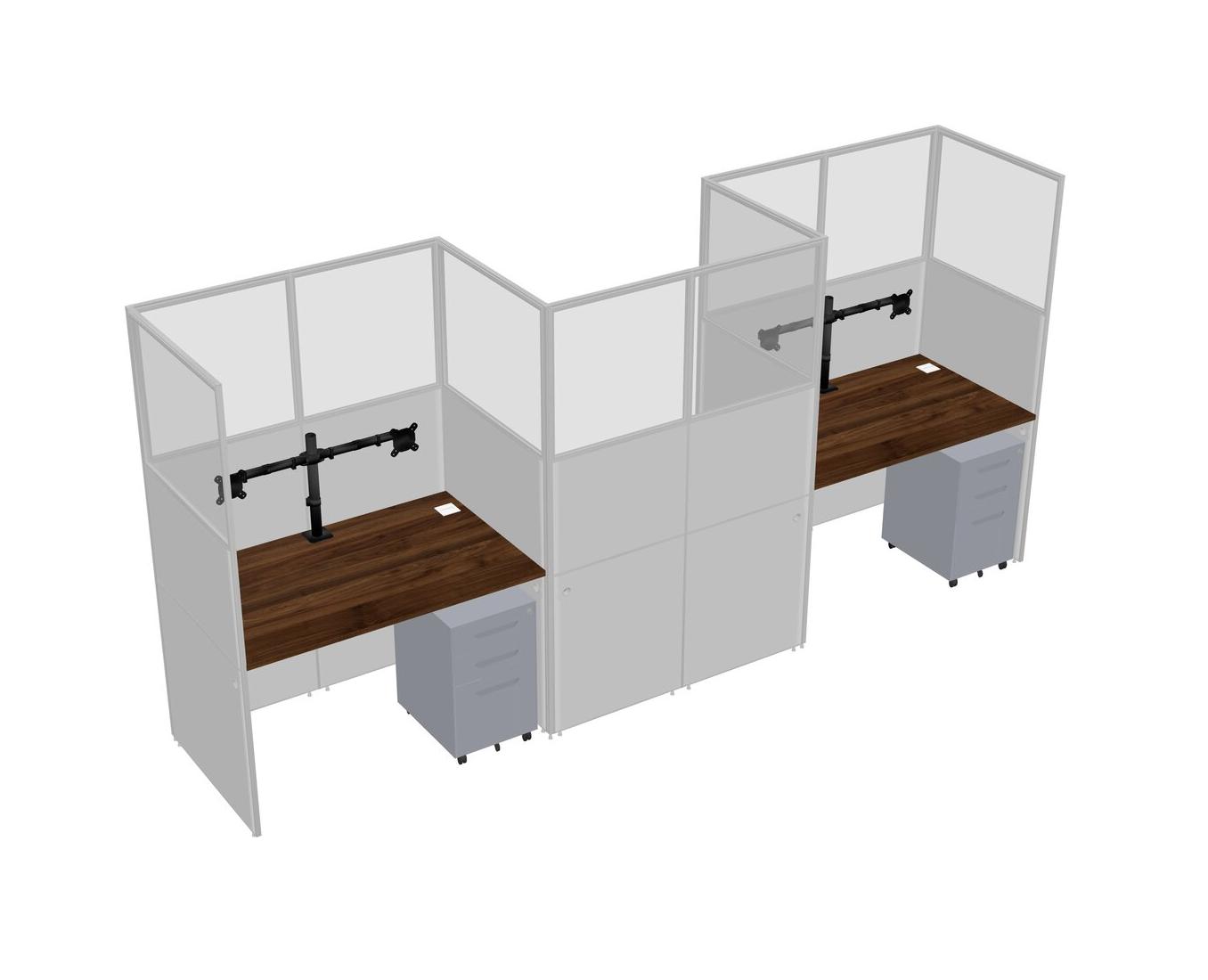 Columbia Walnut Rectangular Cubicle Workstations For 3 - Zigzag Formation + Grey Metal Mobile Drawers
