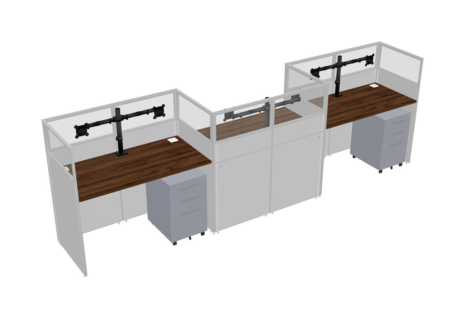 Columbia Walnut Rectangular Cubicle Workstations For 3 - Zigzag Formation + Grey Metal Mobile Drawers