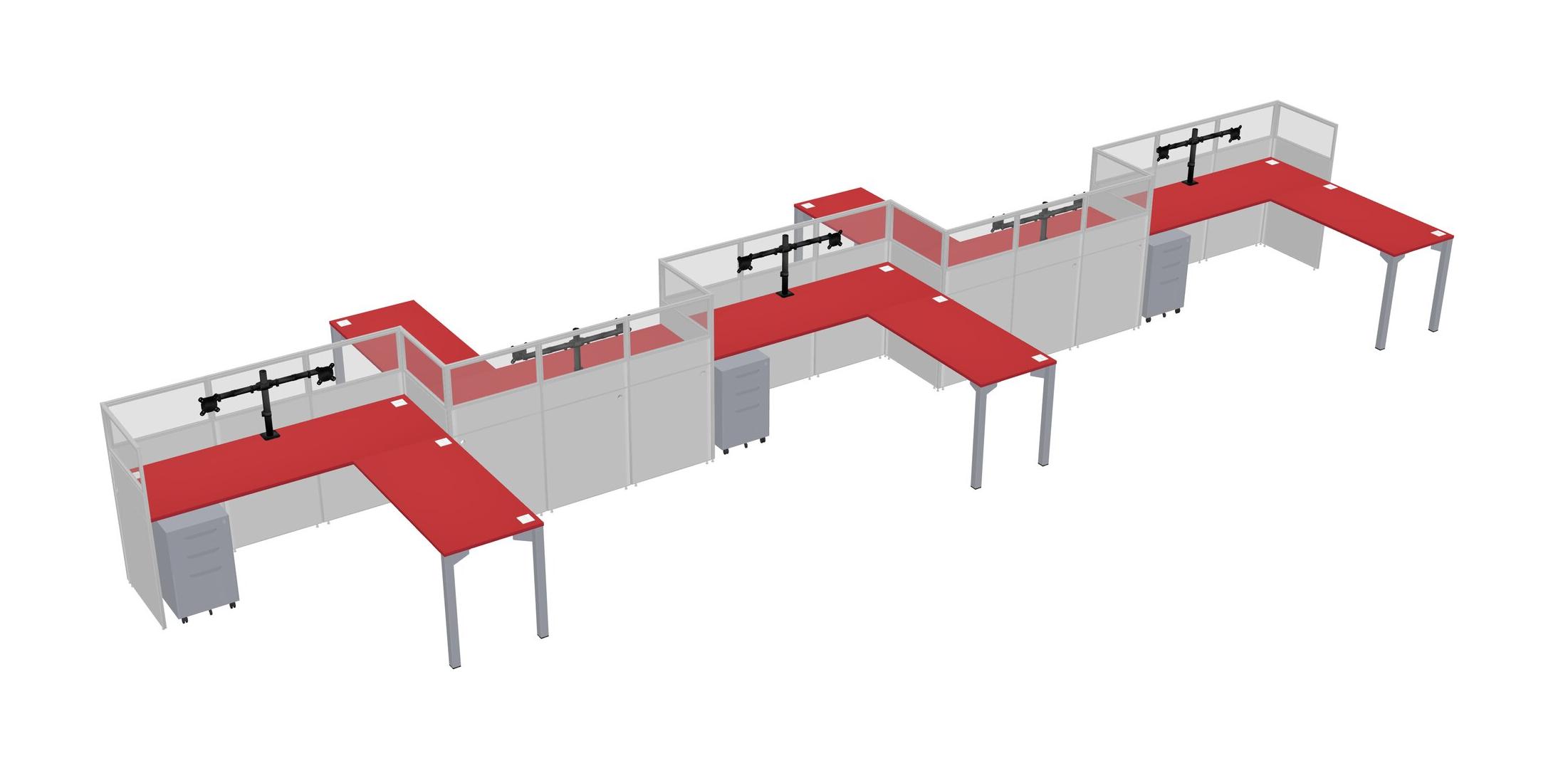 Prism Red L-shape Cubicle Workstations For 5 - Zigzag Formation + Grey Metal Mobile Drawers + Panel Return