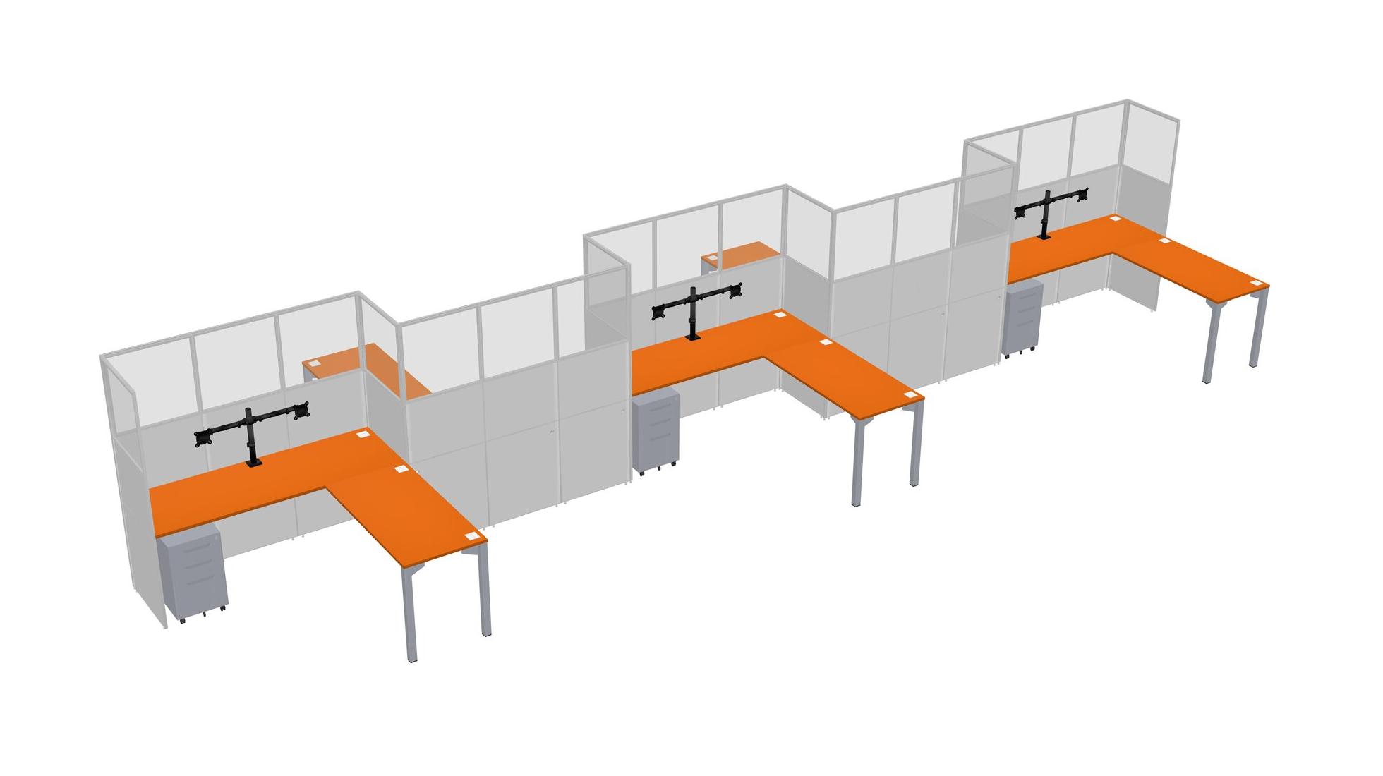 Orange L-shape Cubicle Workstations For 5 - Zigzag Formation + Grey Metal Mobile Drawers + Panel Return