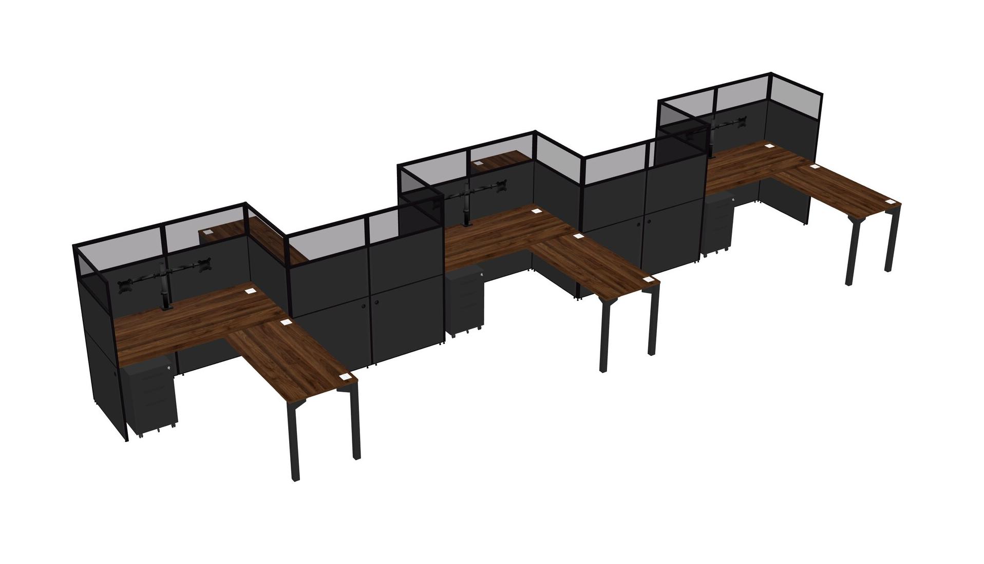 Columbia Walnut L-shape Cubicle Workstations For 5 - Zigzag Formation + Black Metal Mobile Drawers + Panel Return