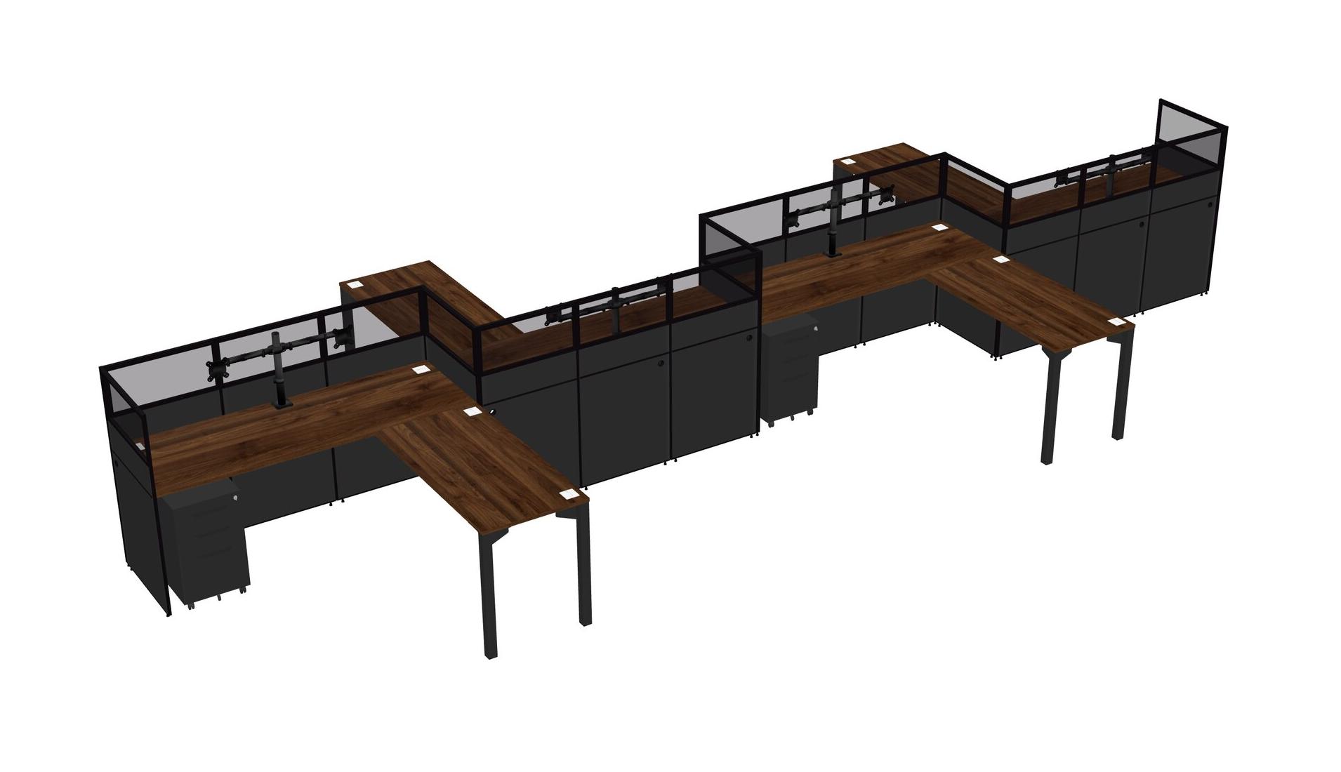 Columbia Walnut L-shape Cubicle Workstations For 4 - Zigzag Formation + Black Metal Mobile Drawers + Panel Return