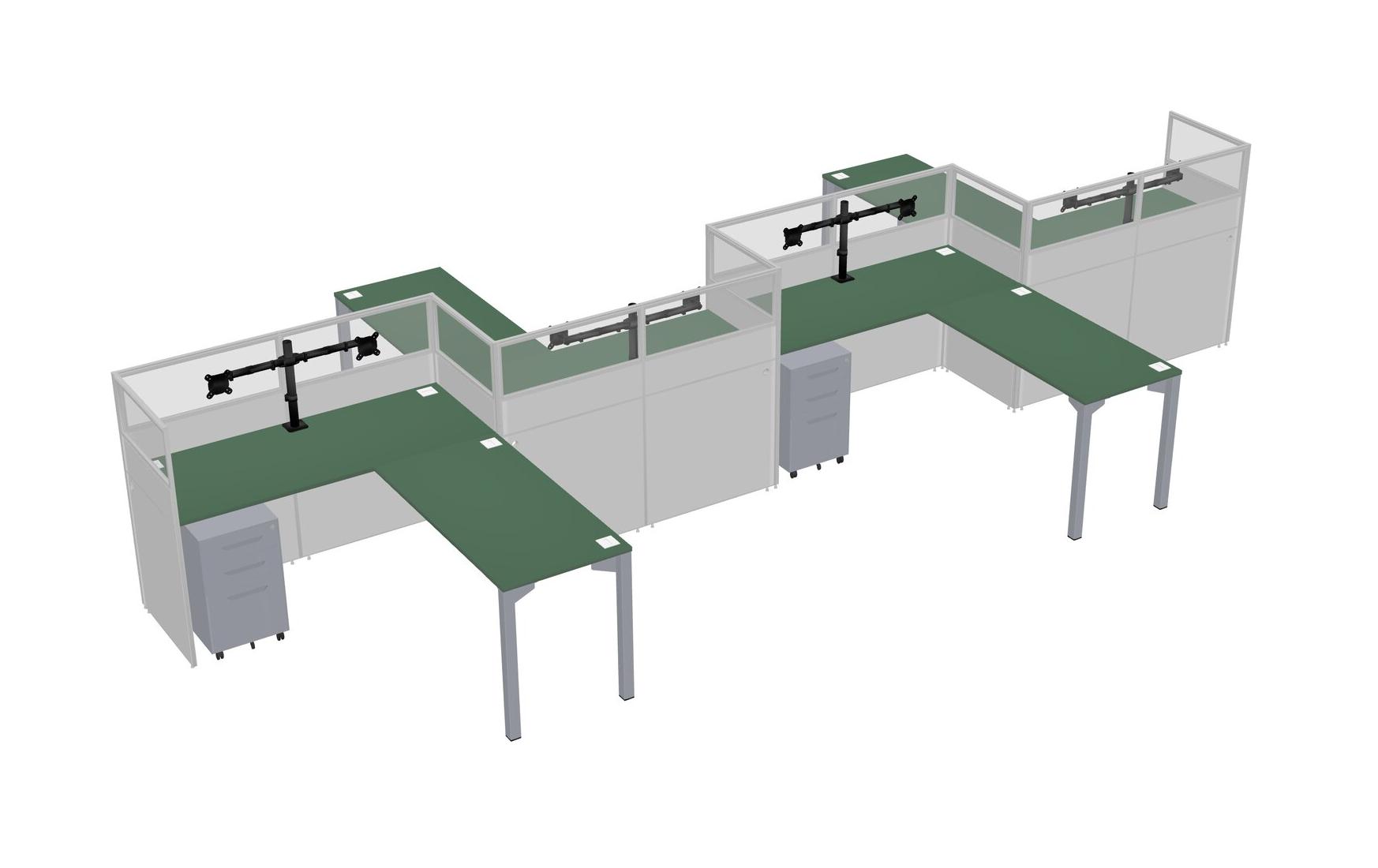 Green L-shape Cubicle Workstations For 4 - Zigzag Formation + Grey Metal Mobile Drawers + Panel Return