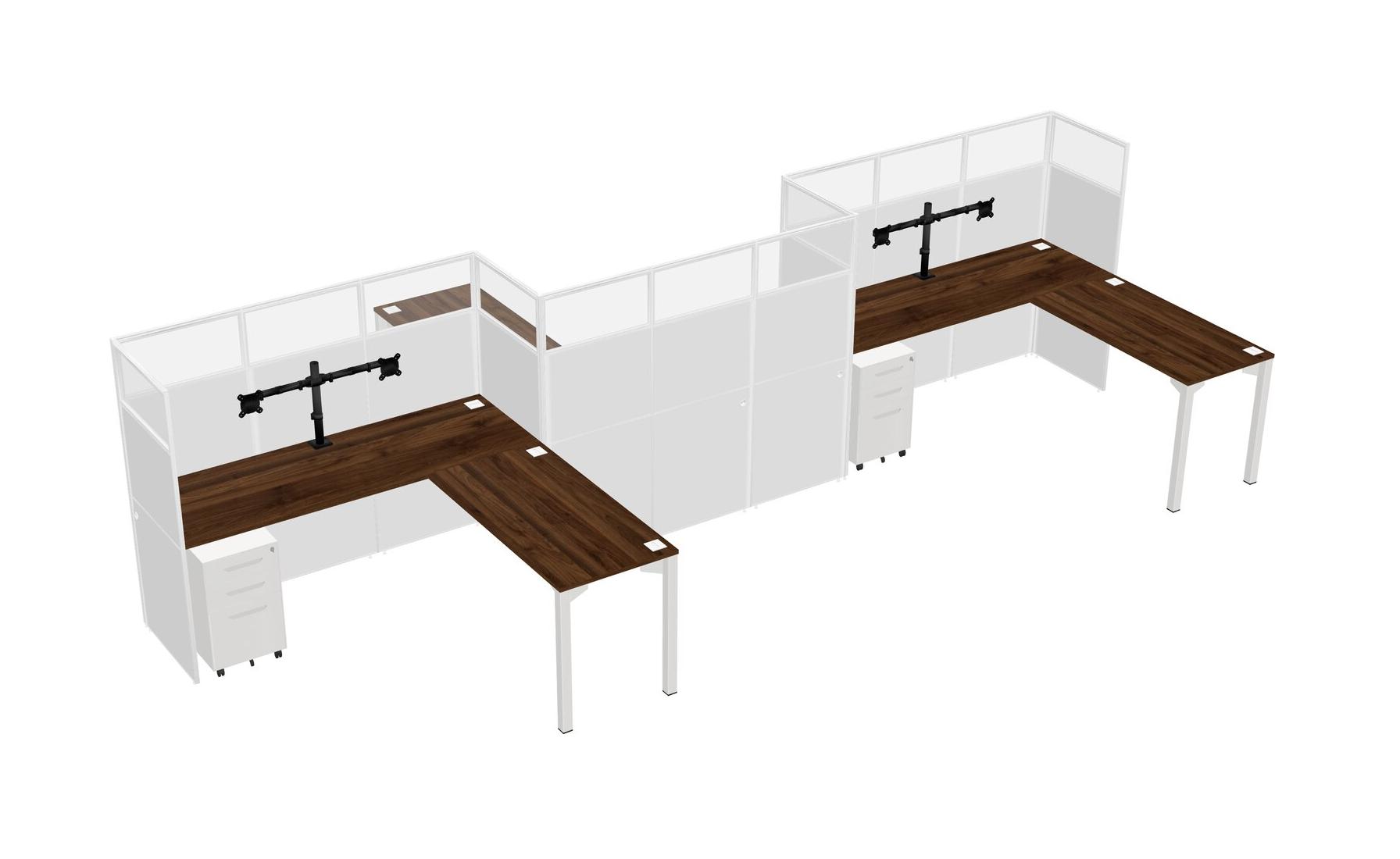 Columbia Walnut L-shape Cubicle Workstations For 3 - Zigzag Formation + White Metal Mobile Drawers + Panel Return