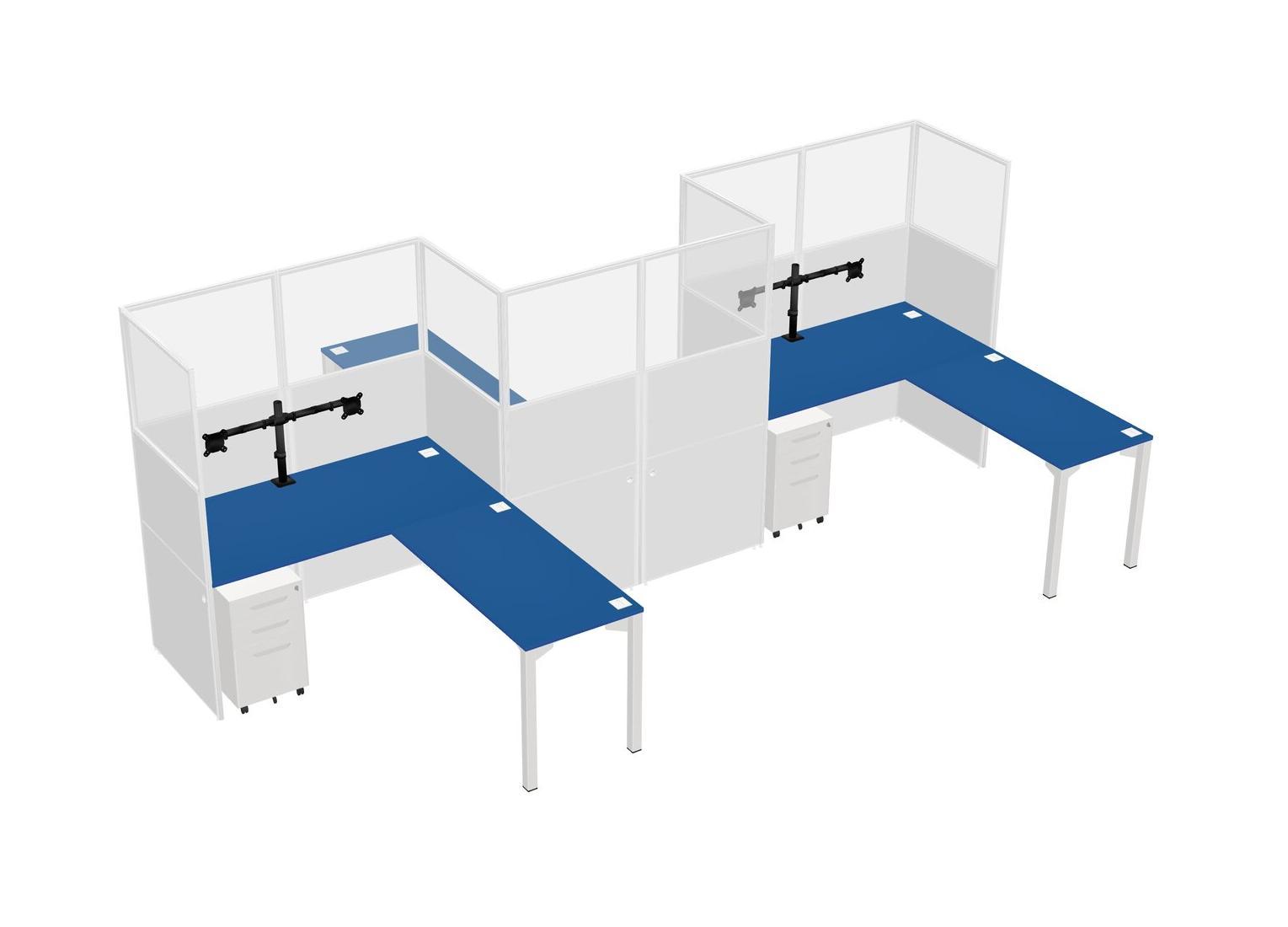 Prism Blue L-shape Cubicle Workstations For 3 - Zigzag Formation + White Metal Mobile Drawers + Panel Return