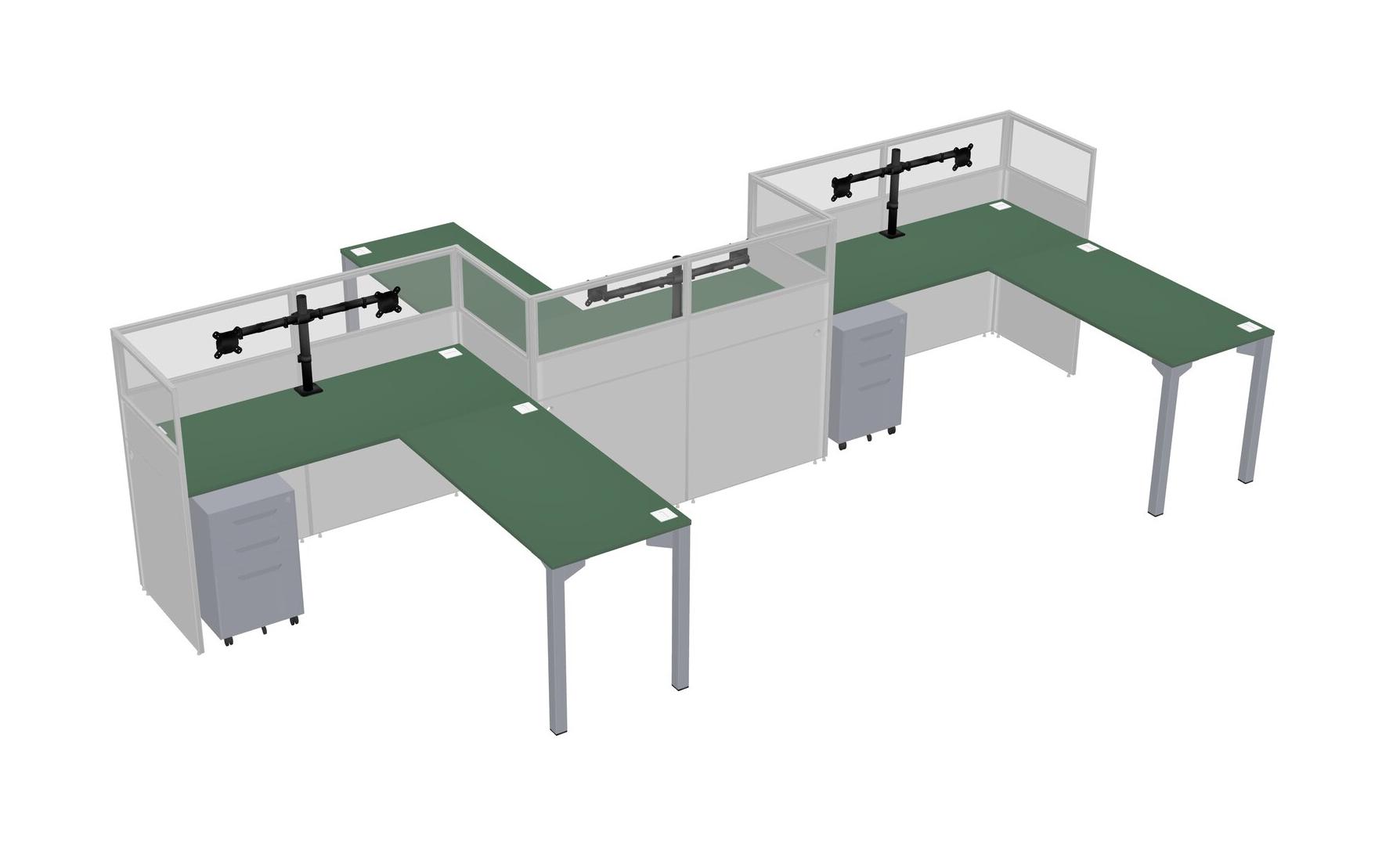 Green L-shape Cubicle Workstations For 3 - Zigzag Formation + Grey Metal Mobile Drawers + Panel Return
