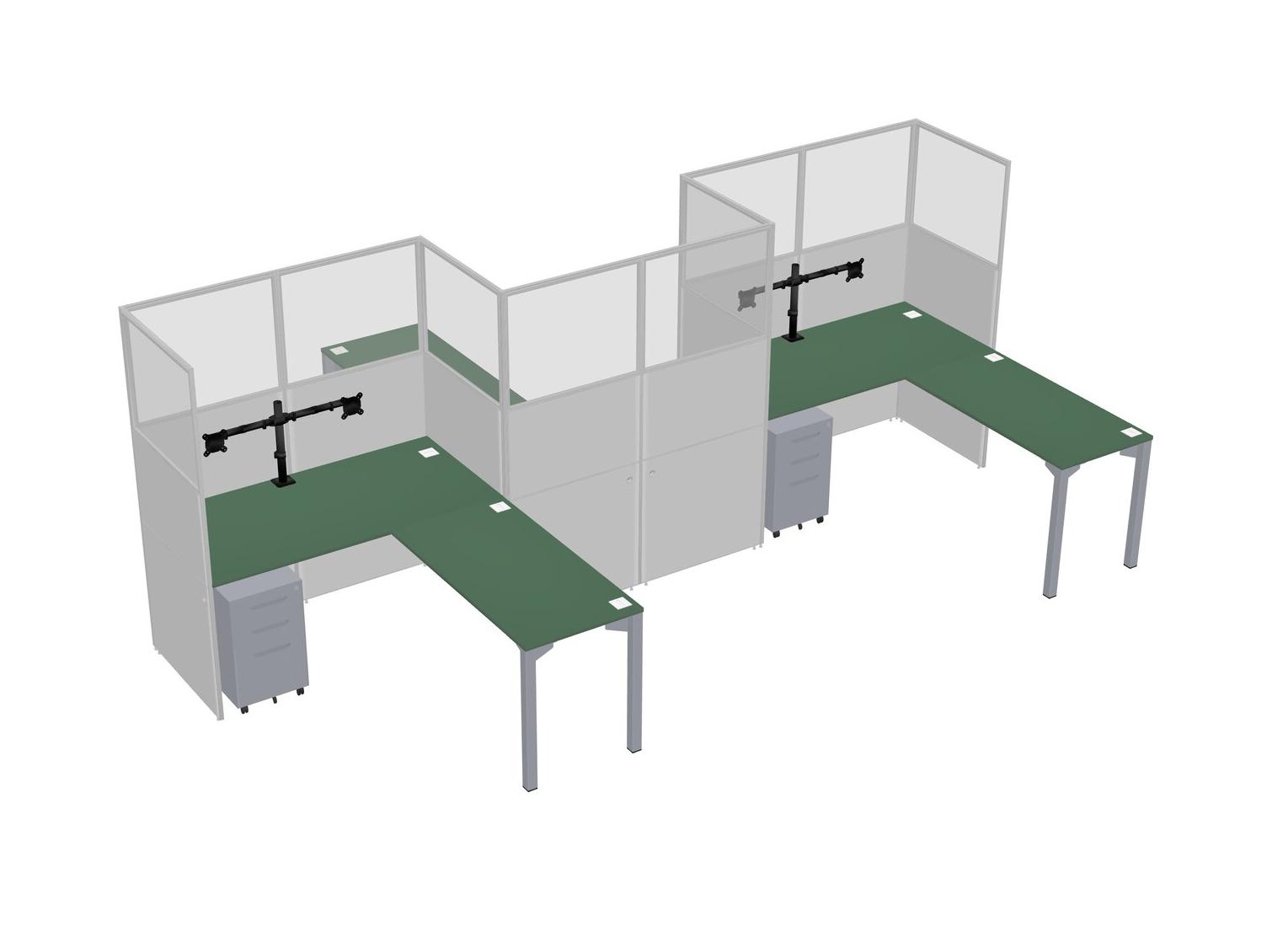 Green L-shape Cubicle Workstations For 3 - Zigzag Formation + Grey Metal Mobile Drawers + Panel Return
