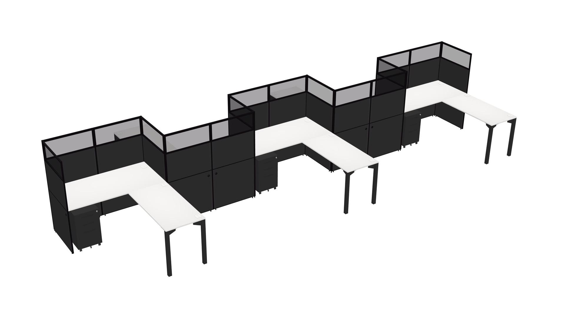 White L-shape Cubicle Workstations For 5 - Zigzag Formation + Black Metal Mobile Drawers + Panel Return