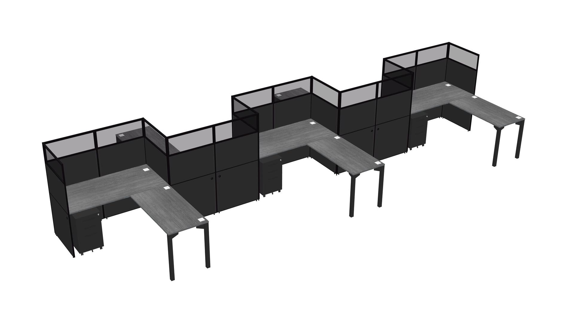 Grey L-shape Cubicle Workstations For 5 - Zigzag Formation + Black Metal Mobile Drawers + Panel Return