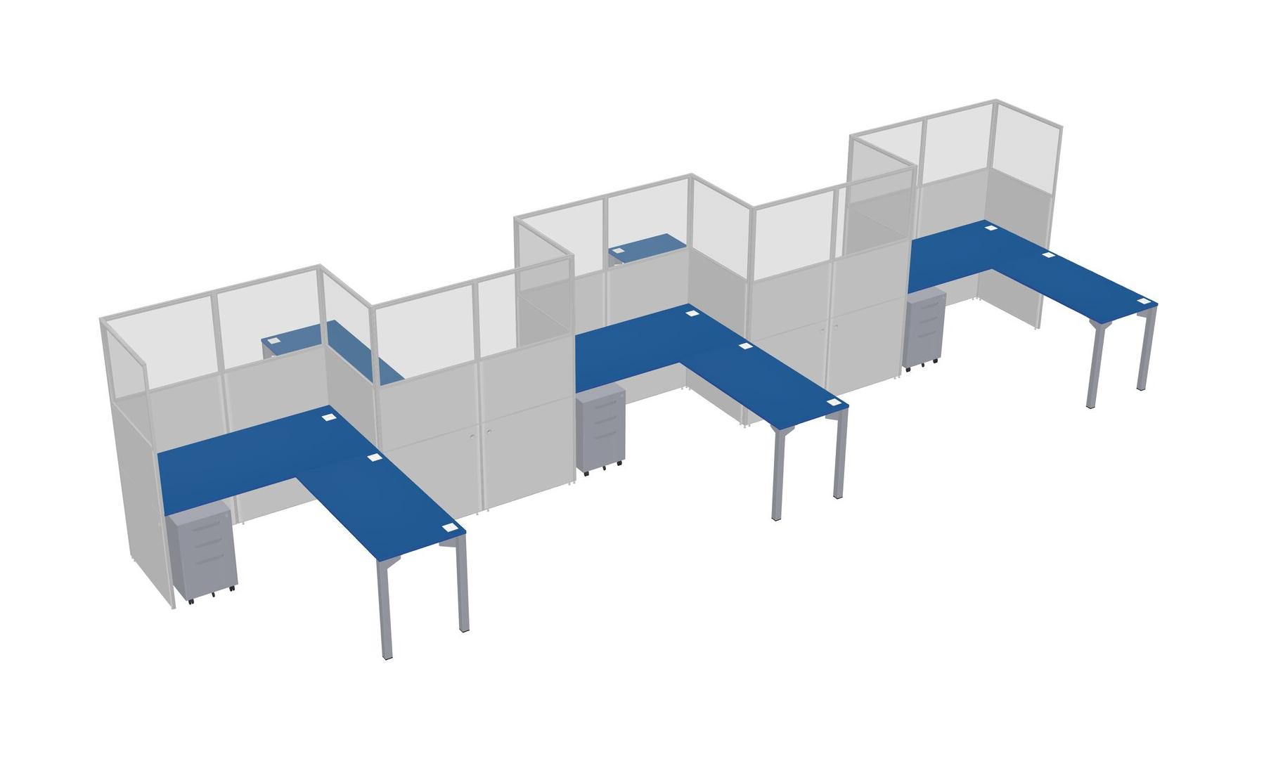 Prism Blue L-shape Cubicle Workstations For 5 - Zigzag Formation + Grey Metal Mobile Drawers + Panel Return