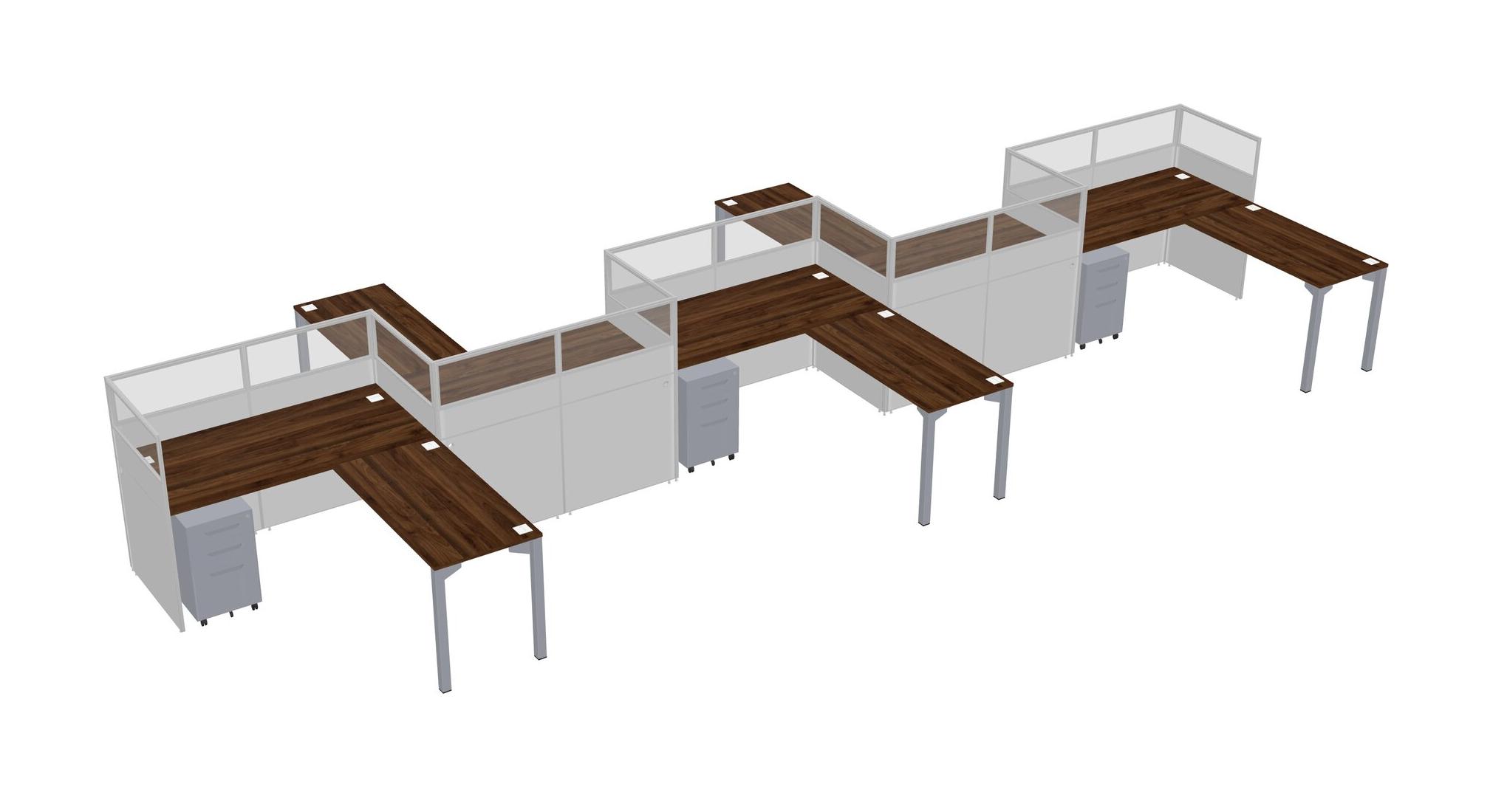 Columbia Walnut L-shape Cubicle Workstations For 5 - Zigzag Formation + Grey Metal Mobile Drawers + Panel Return