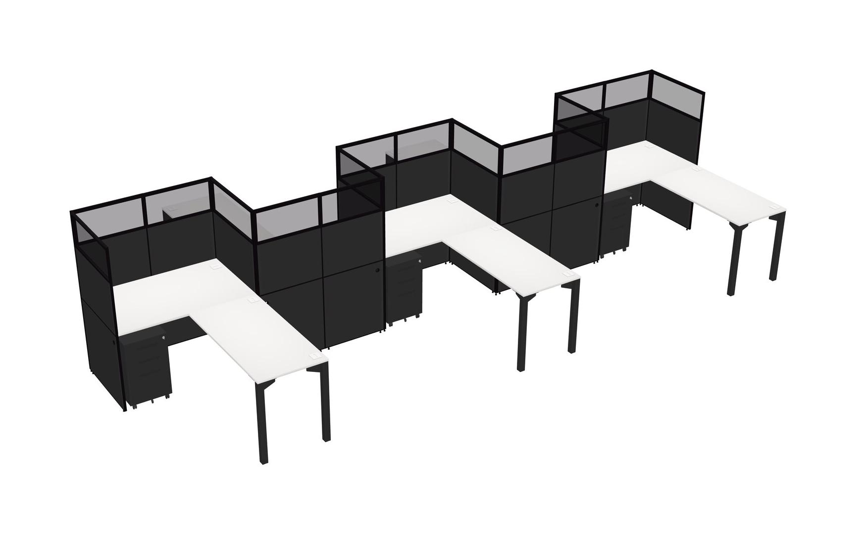 White L-shape Cubicle Workstations For 5 - Zigzag Formation + Black Metal Mobile Drawers + Panel Return