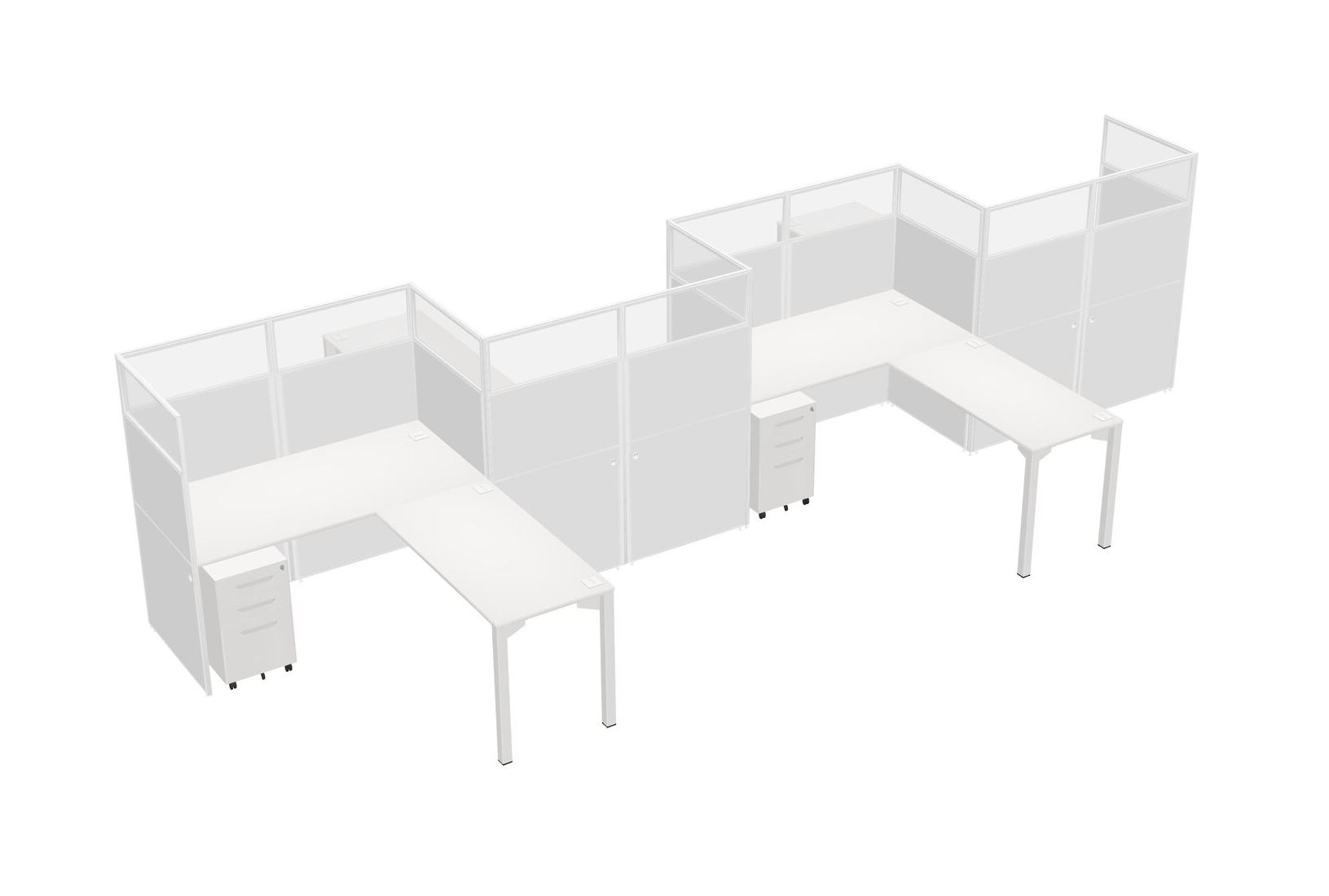 White L-shape Cubicle Workstations For 4 - Zigzag Formation + White Metal Mobile Drawers + Panel Return