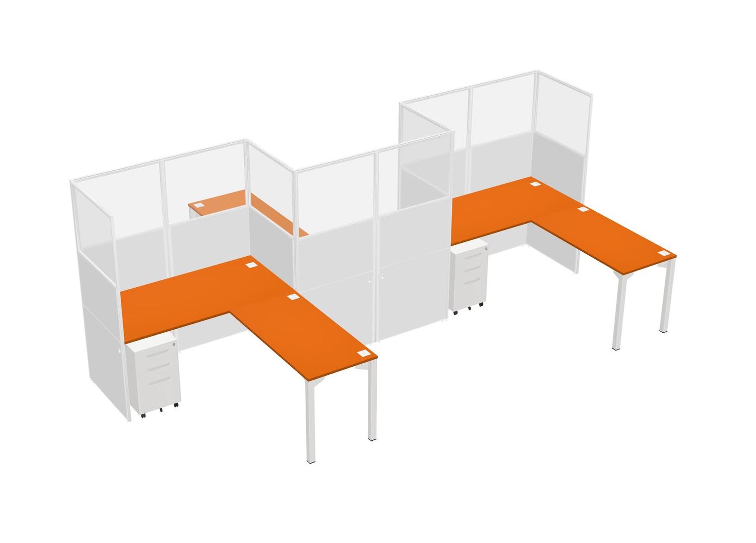 Orange L-shape Cubicle Workstations For 3 - Zigzag Formation + White Metal Mobile Drawers + Panel Return