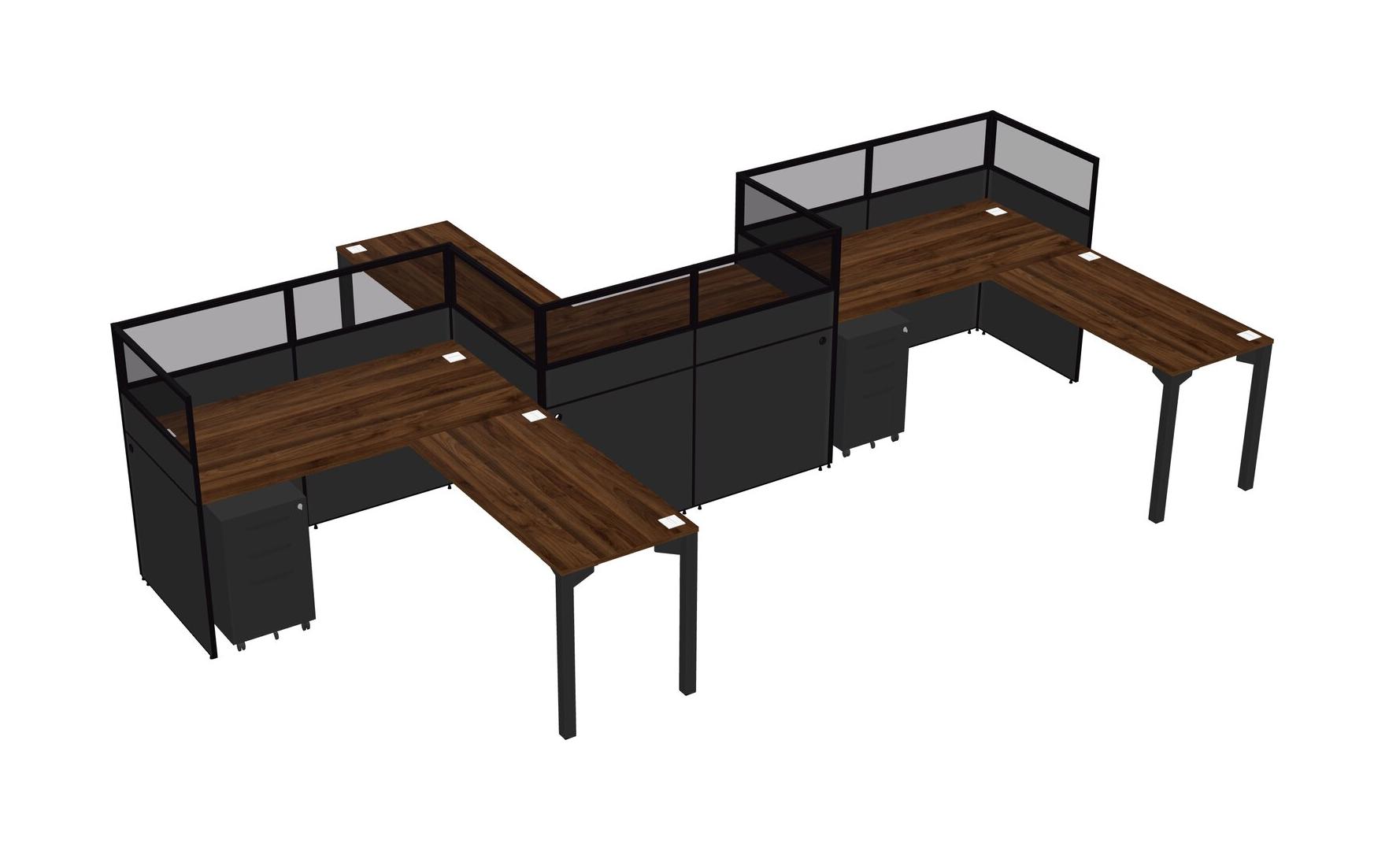 Columbia Walnut L-shape Cubicle Workstations For 3 - Zigzag Formation + Black Metal Mobile Drawers + Panel Return
