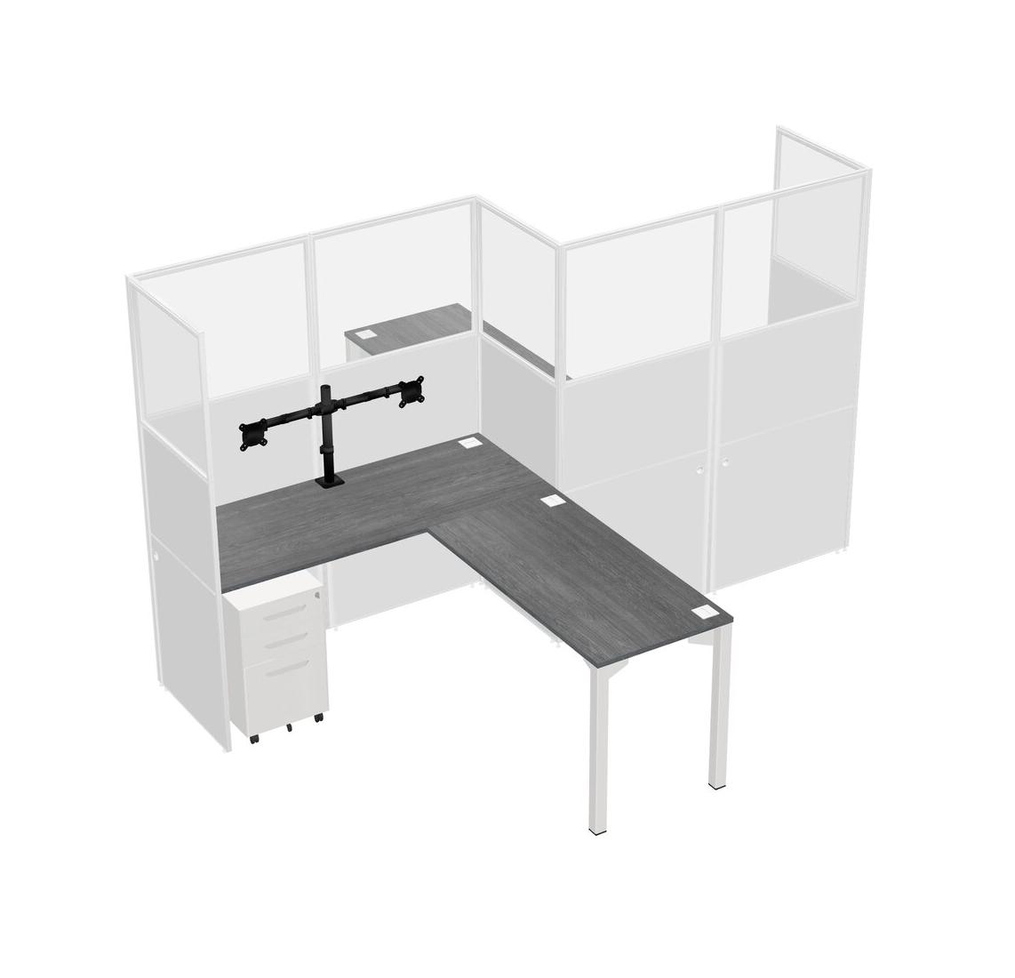 Grey L-shape Cubicle Workstations For 2 - Zigzag Formation + White Metal Mobile Drawers + Panel Return