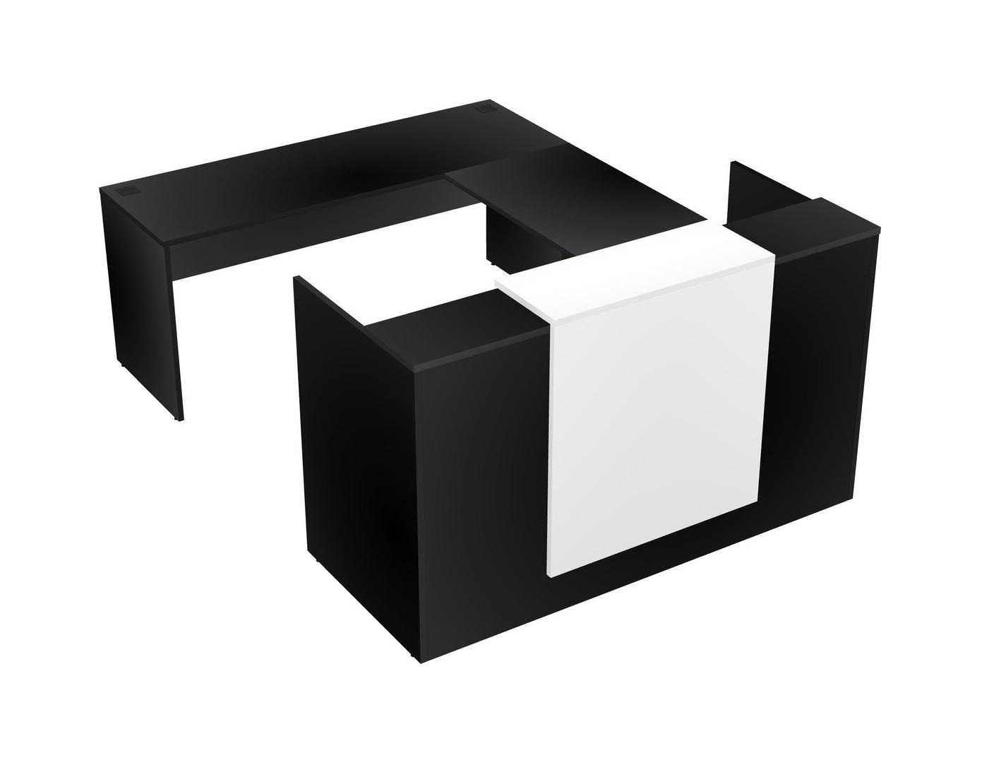 Comptoir D'accueil Modulaire Noir + Tiroirs Mobiles En Bois + Bureau Crédence + Comptoir Flottant