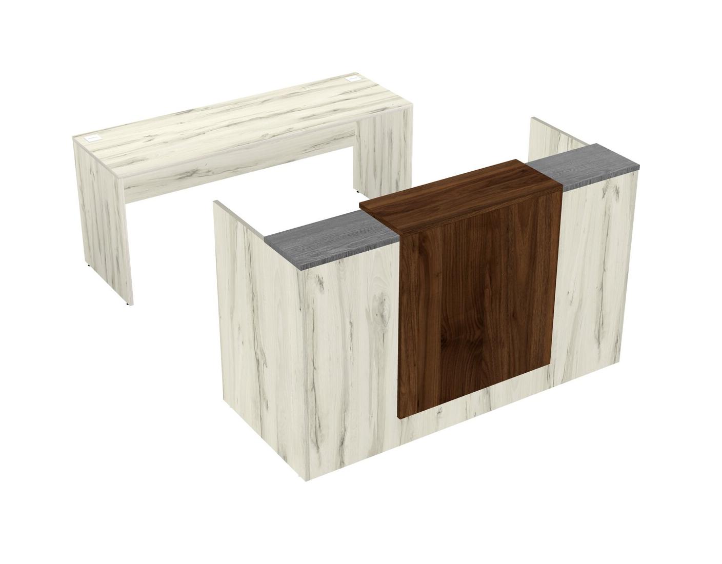 Comptoir D'accueil Modulaire Gris + Tiroirs Mobiles En Bois + Bureau Crédence + Comptoir Flottant