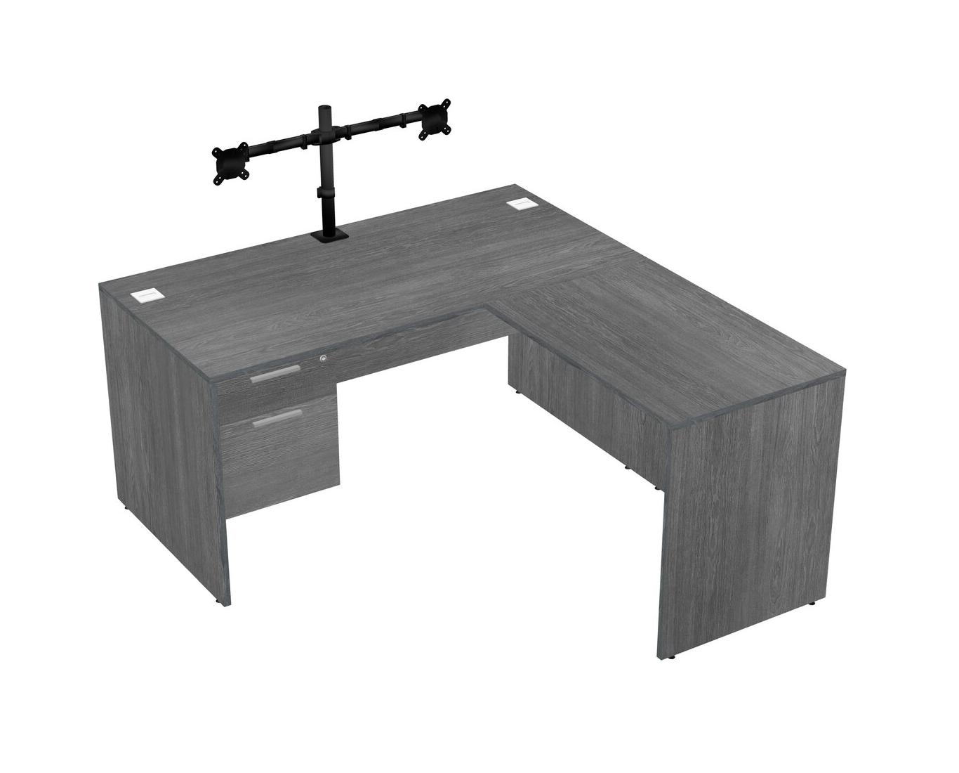 Bureau Gris En L Avec Tiroirs Suspendus Gris Et Bras D'écran Noir (bras Doubles)