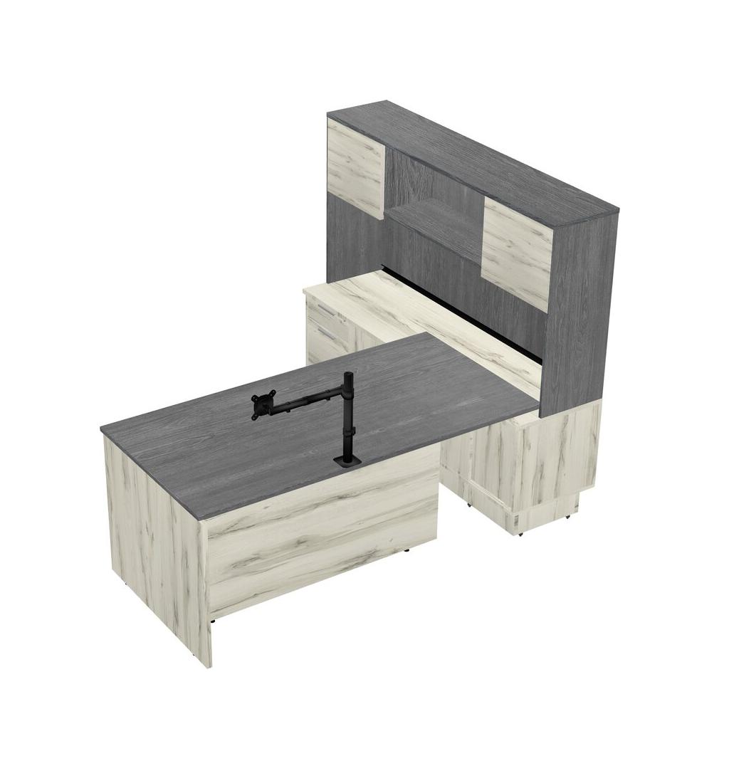Bureau De Direction Gris Moderne Avec Armoire Basse à Portes Coulissantes Et Tiroirs Intégrés, Support D'écran (bras Simple) Et Clapier
