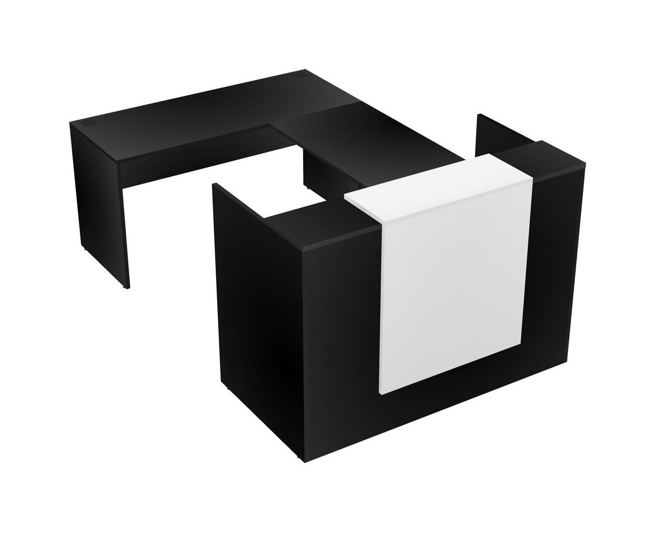 Comptoir D'accueil Modulaire Noir + Tiroirs Mobiles En Bois + Bureau Crédence + Comptoir Flottant