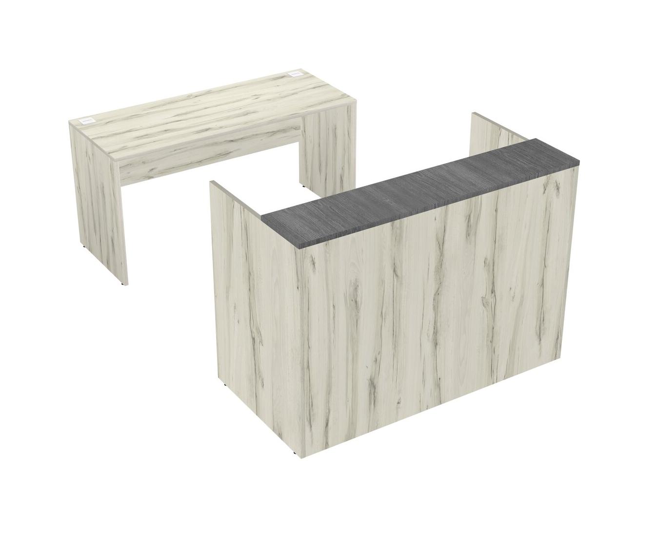 Comptoir D'accueil Modulaire Gris + Tiroirs Mobiles En Bois + Bureau Crédence