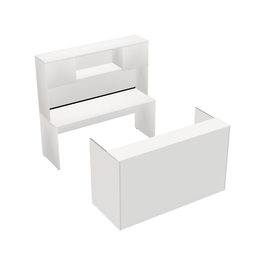 Comptoir D'accueil Modulaire Blanc + Tiroirs Mobiles En Bois + Bureau Crédence + Bahut