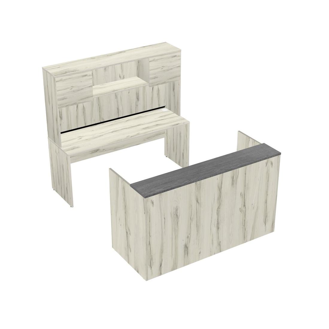 Comptoir D'accueil Modulaire Gris + Tiroirs Mobiles En Bois + Bureau Crédence + Bahut