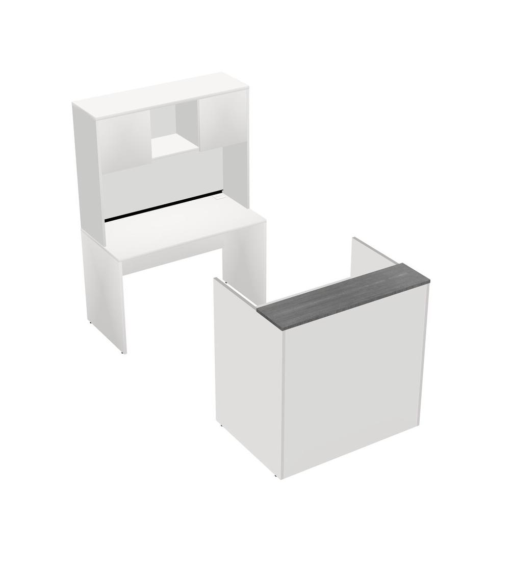 Comptoir D'accueil Modulaire Gris + Tiroirs Mobiles En Bois + Bureau Crédence + Bahut