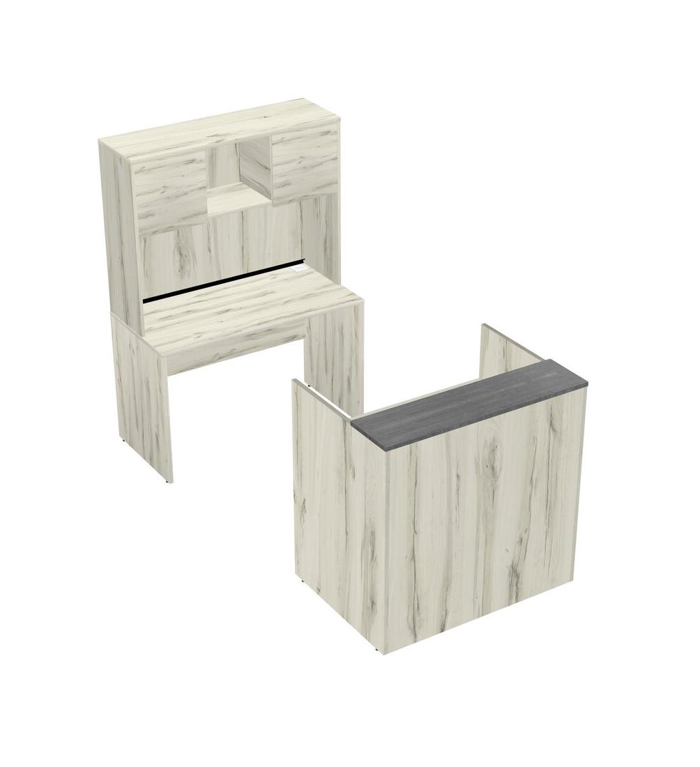 Comptoir D'accueil Modulaire Gris + Tiroirs Mobiles En Bois + Bureau Crédence + Bahut