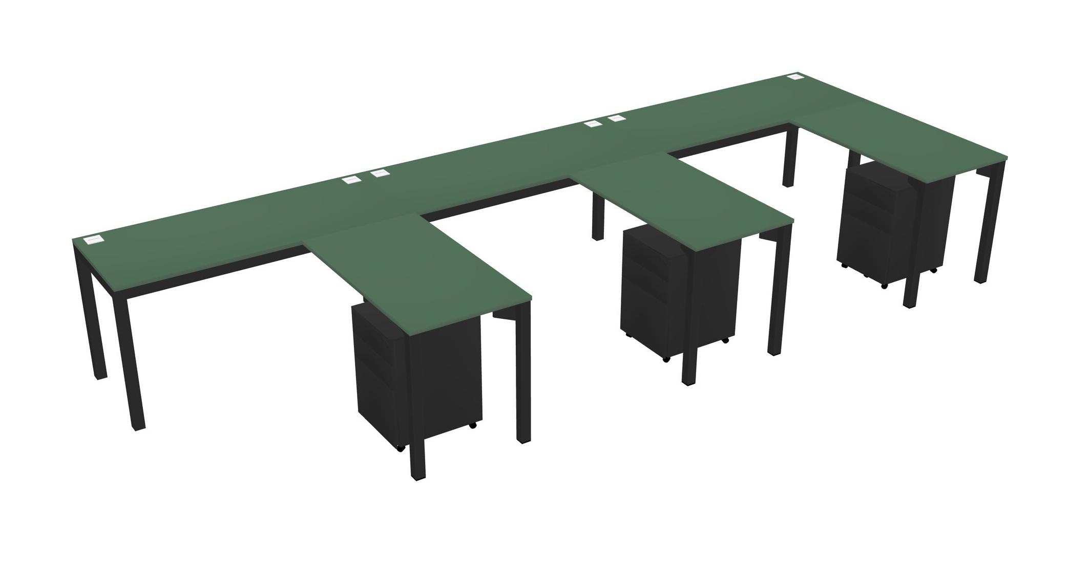 Green L-shaped Office Desk With Metal Mobile Drawers For 3 Persons